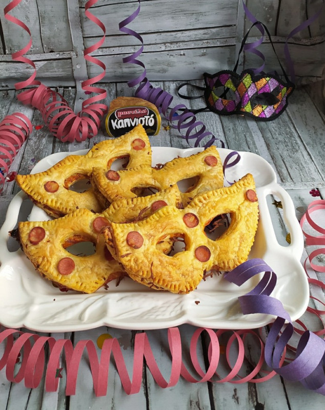 - Κόβουμε τη σφολιάτα μας σε σχέδιο μάσκας 12 τεμ για 6 μεγάλες και χορταστικές μάσκες.