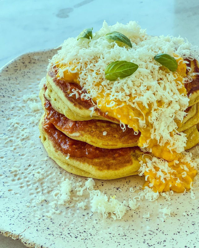 Ο δικός μου καγιανάς με τη μορφή pancake, έχει χωριάτικα αυγά, κατσικίσιο Μαστέλο και μια χειροποίητη pesto rosso. Enjoy!
