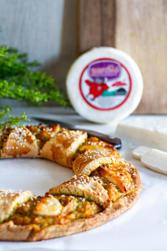 Βάζω περιμετρικά τη γέμιση στην άκρη του φύλλου αφήνοντας κενό ένα δάχτυλο εξωτερικά, και αφήνοντας κενό και το κέντρο του. Κόβω το κενό ακτινωτά σε οκτώ τρίγωνα (όπως τα κομμάτια της πίτσας) και τα αναδιπλώνω προς την πλευρά της γέμισης. Περνάω με ασπράδι το ζυμάρι και πασπαλίζω με σουσάμι. Κόβω τις φέτες του τυριού σε τρίγωνα κομμάτια και τοποθετώ σε κάθε σημείο που δεν υπάρχει καλυμμένη ζύμη. Ψήνω σε προθερμασμένο φούρνο στους 180 βαθμούς για 35’ περίπου ή έως να ροδίσει καλά. Απολαμβάνω την τάρτα ζέστη ή κρύα.