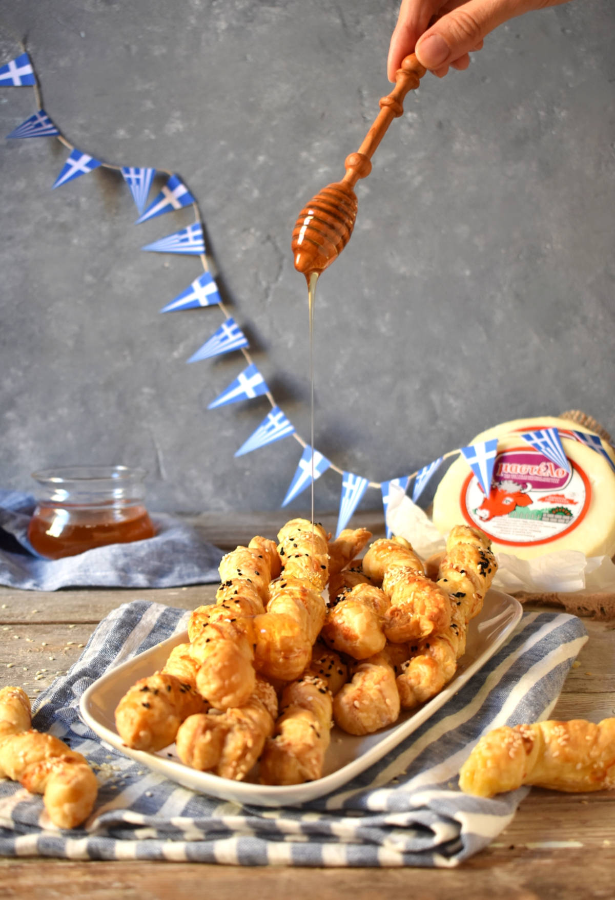 Κόβουμε λωρίδες και στην συνέχεια τις στρίβουμε με το χέρι. Αλείφουμε την επιφάνεια με αυγό και γάλα και πασπαλίζουμε με άσπρο και μαύρο σουσάμι.