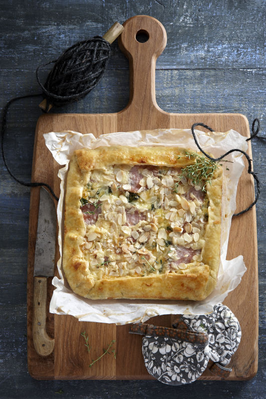 - Στρώνουμε σε ταψί με αντικολλητικό χαρτί το φύλλο σφολιάτας και από πάνω απλώνουμε τις πατάτες και σκορπίζουμε το λουκάνικο και το μπέικον. Κλείνουμε περιμετρικά τη σφολιάτα σχηματίζοντας γύρω-γύρω ένα πλαίσιο.