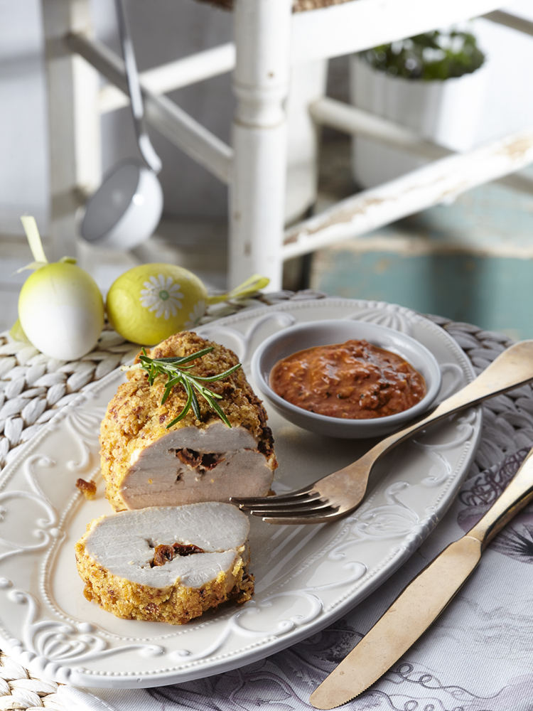 - Στο μεταξύ ετοιμάζουμε το κοτόπουλο. Προθερμαίνουμε τον φούρνο στους 180°C στον αέρα. Απλώνουμε το φιλεταρισμένο κοτόπουλο στον πάγκο εργασίας μας.