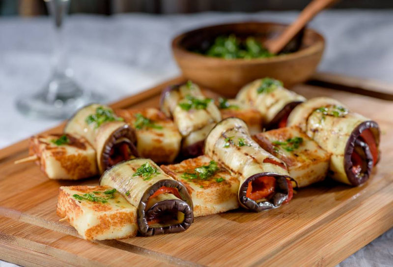 - Περνάμε στα ξυλάκια για σουβλάκια από τρία ρολά μελιτζάνας εναλλάξ με τρία κομμάτια μαλακό τυρί Μαστέλο®.