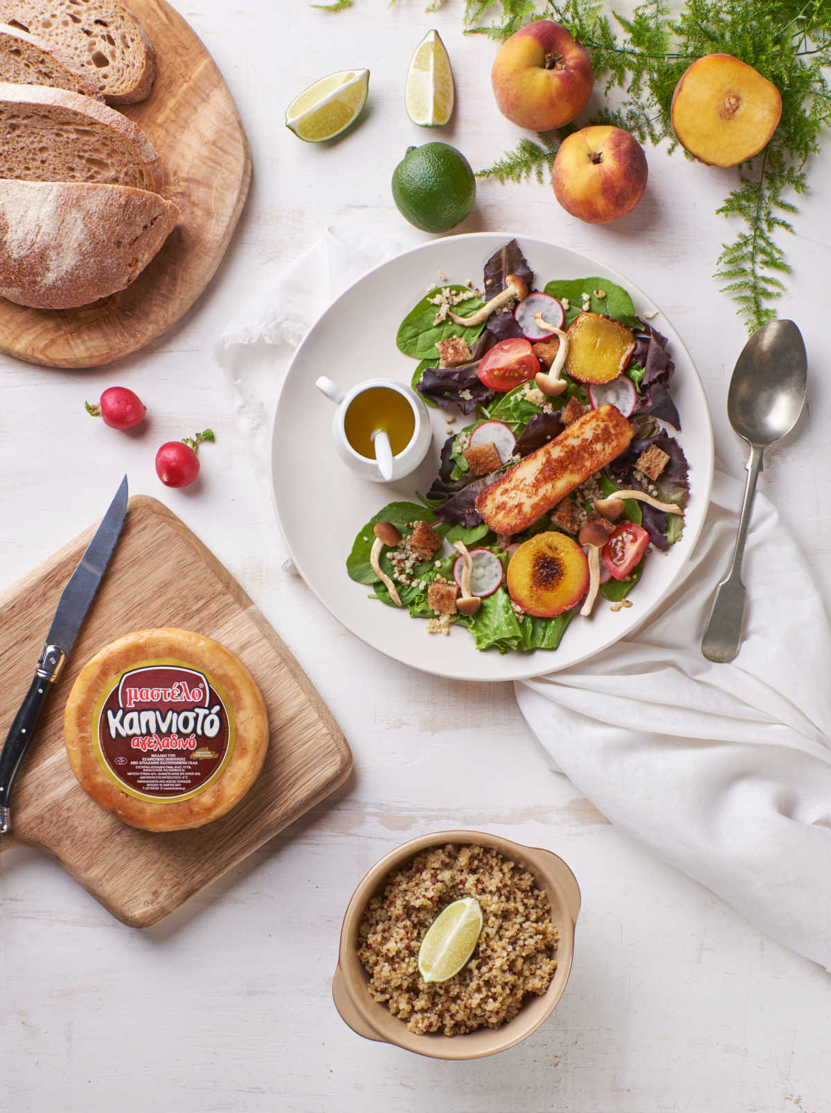 - Σερβίρουμε σε κάθε μεγάλο πιάτο τα φύλλα λαχανικών, μερικά μανιτάρια, νεκταρίνια, ραπανάκια, την κινόα και μια φέτα τυριού.
